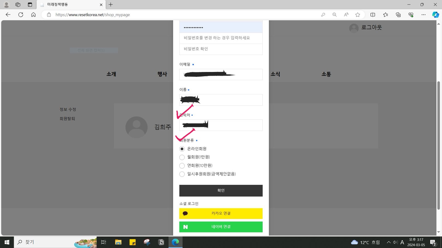 회원 정보 수정은 다음과 같이 해 주시면 됩니다.